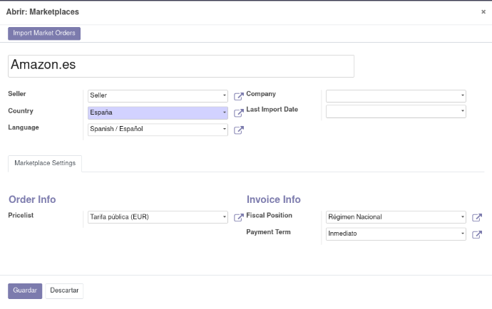 Una vez rellenados estos datos se podrán importar todos los marketplaces del vendedor y posteriormente los pedidos.