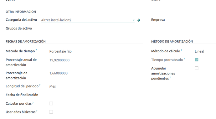 Este módulo, desarrollado con la participación de miembros de la Asociación Española de Odoo (AEODOO), complementa la gestión de activos en Odoo al incluir configuraciones específicas para la normativa fiscal y contable de España. Permite aplicar los cálculos de amortización según los criterios establecidos en la legislación local, asegurando un cumplimiento adecuado.
