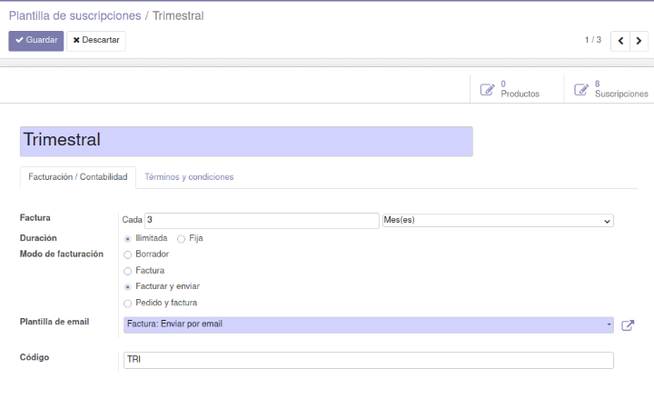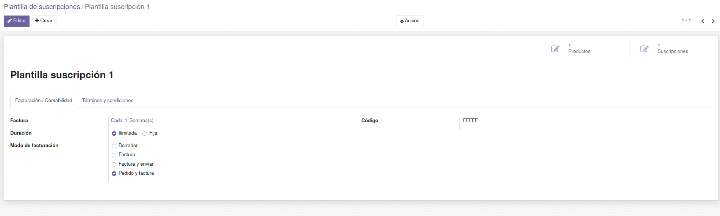 Existe la posibilidad de crear productos de tipo servicio desde este módulo, de manera muy similar a como lo hacemos habitualmente, a los que se les podrá asignar una plantilla de suscripciones. Estos son los servicios que ofertamos, por lo que al usar su plantilla asociada en una suscripción automatizará gran parte del proceso.