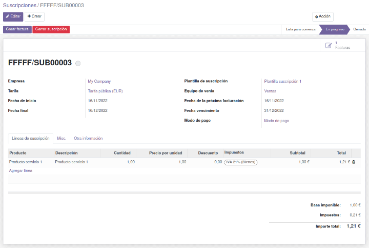 Crear una suscripción en Odoo es muy sencillo: concretamos los campos conforme a nuestras necesidades, seleccionamos la plantilla que más se ajuste y añadimos el servicio o los servicios que deseemos. Tendremos la capacidad de crear una factura manualmente o cerrar la suscripción desde el mismo formulario.